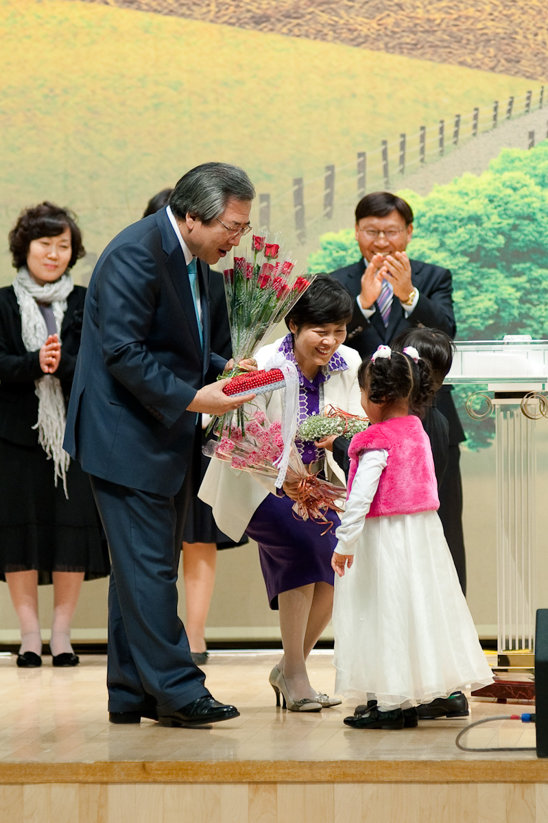 ▲ 제자훈련 1기부터 14기까지 각기수별 대표로 나오신 분들이 담임목사님과 사모님께 꽃을 증정하는 시간