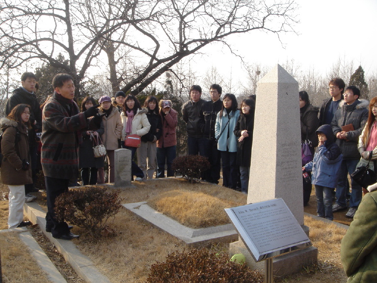 (2) 우리나라 최초의 의료선교사이며 최초로 양화진 외국인 선교사묘지에 묻힌 "존 헤론" 의 묘에서 이용남 선교사님의 설명을 듣고 있다. 존 헤론은 연세 세브란스의료원의 전신인 광혜원을 섬겼던 의료선교사였다. (1885.6 입국 1890.7 이질로 사망)