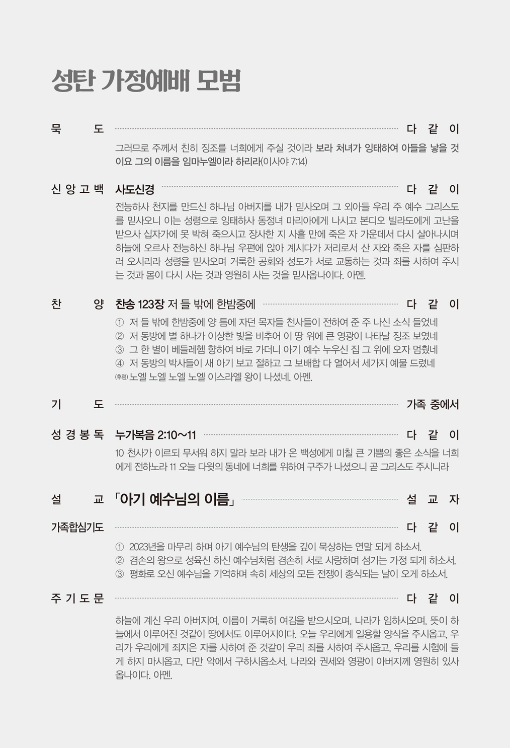 | » | 2023-12-24 | 성탄절 가정예배 모범 | |