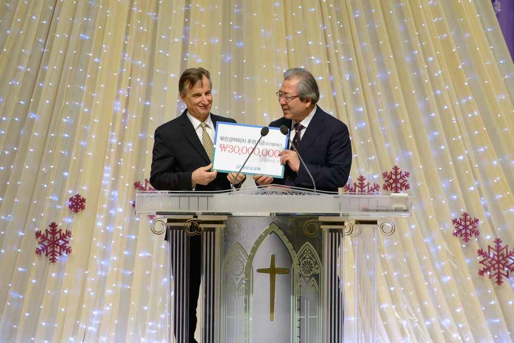 지난 주일(12/13)에는 유진벨 재단(회장: 스티브 린튼. 한국명 인세반)에 새로남카페 수익금 중 일부를 성금으로 전달하는 시간을 가졌습니다. 2015년 한 해 동안 북한 결핵 퇴치 사역을 영상으로 함께 본 후 인세반 회장님은 “다제내성 결핵에 걸려 죽음을 기다릴 수 밖에 없는 북한 동포들에게 치료약을 후원해 주신 교회와 성도님께 감사의 마음을 전합니다.”라고 감사인사를 전하셨습니다.